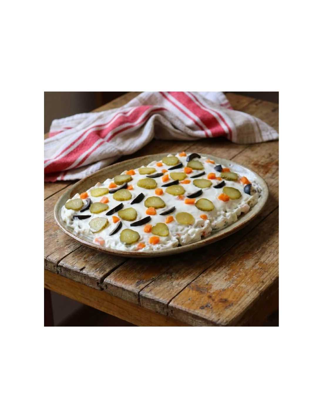 Ingrediente: cartofi, carne de curcan, morcovi, pătrunjel rădăcină, țelină, murături, castraveți la oțet, mazăre, ulei de floarea soarelui, ouă, muștar, condimente, sare, piper.
