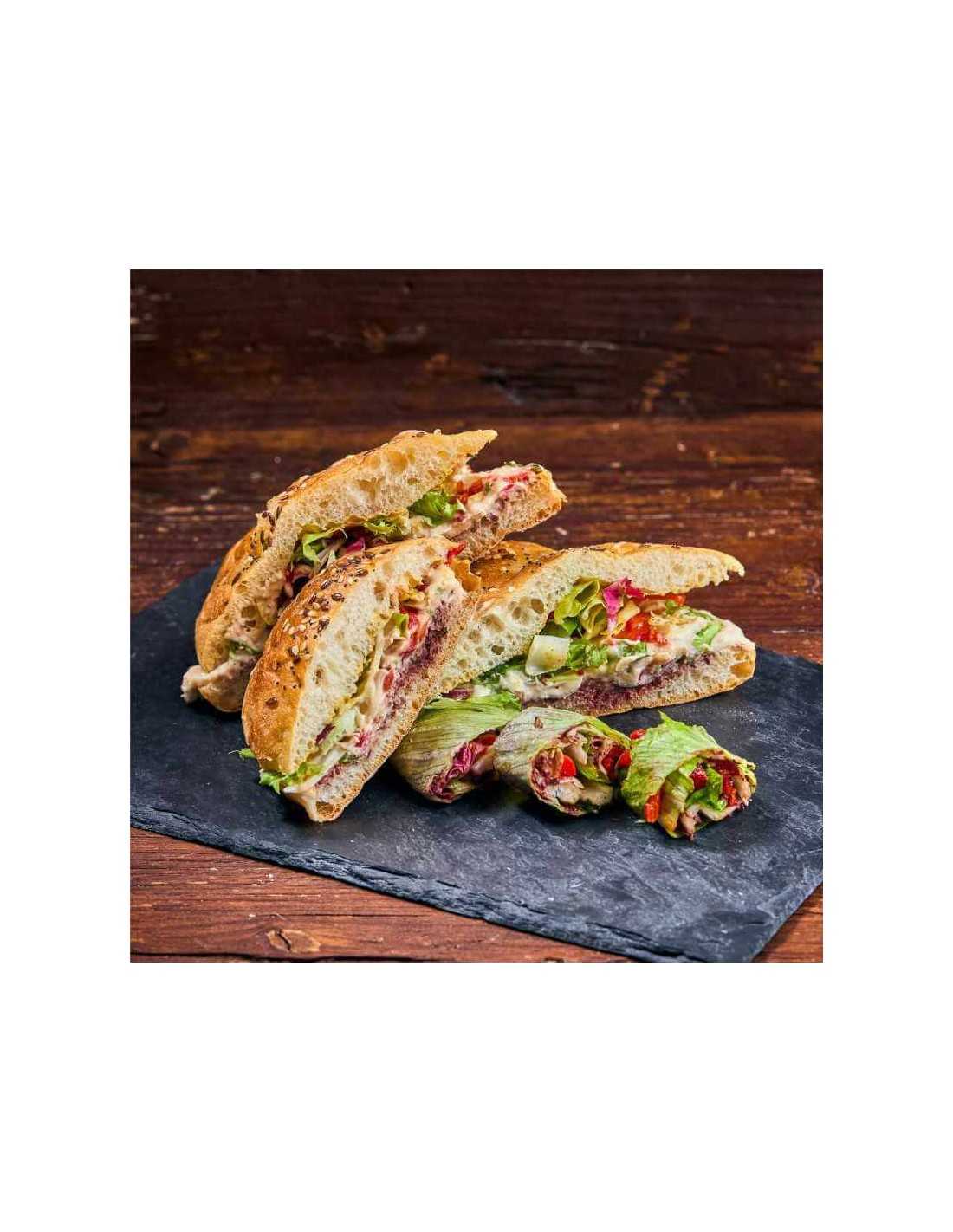 Ingrediente: ciabatta*, humus de fasole (fasole albă, tahini*, chimion, usturoi granulat, ulei de măsline, zeamă de lămâie), pastă de măsline kalamata, ceapă verde, mix de salată, muștar picant*.