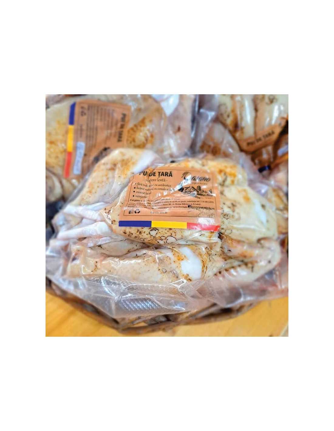 Puii sunt crescuti la sol, minim 90 de zile si sunt hraniti 100% natural, cu iarba (in perioada verii) si cu cereale: porumb, grau si floarea soarelui.
