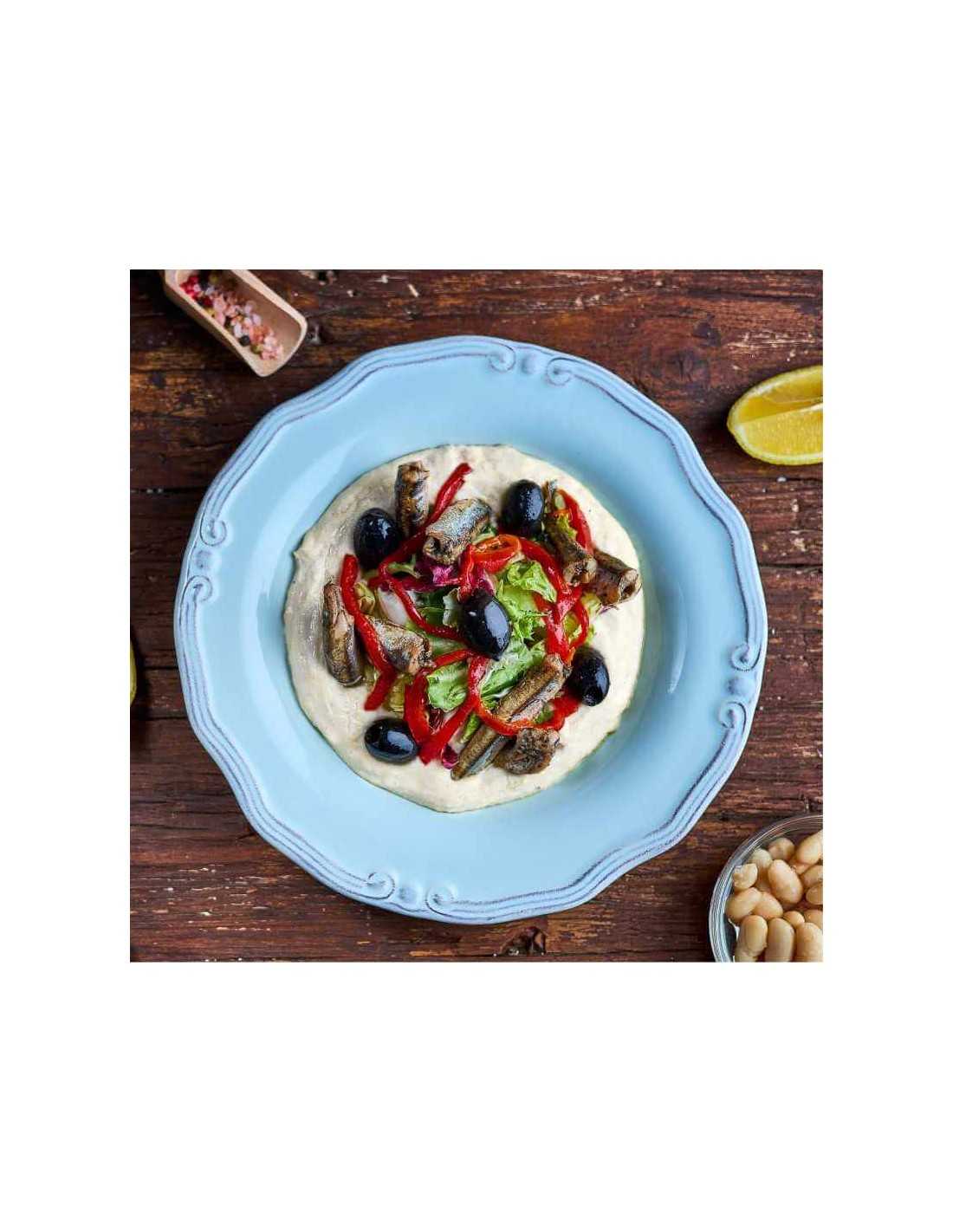 Ingrediente: humus de fasole (fasole albă, tahini*, chimion, usturoi granulat, ulei de măsline, zeamă de lămâie), anșoa*, mix de salată, ardei capia copt, măsline, sare, piper.